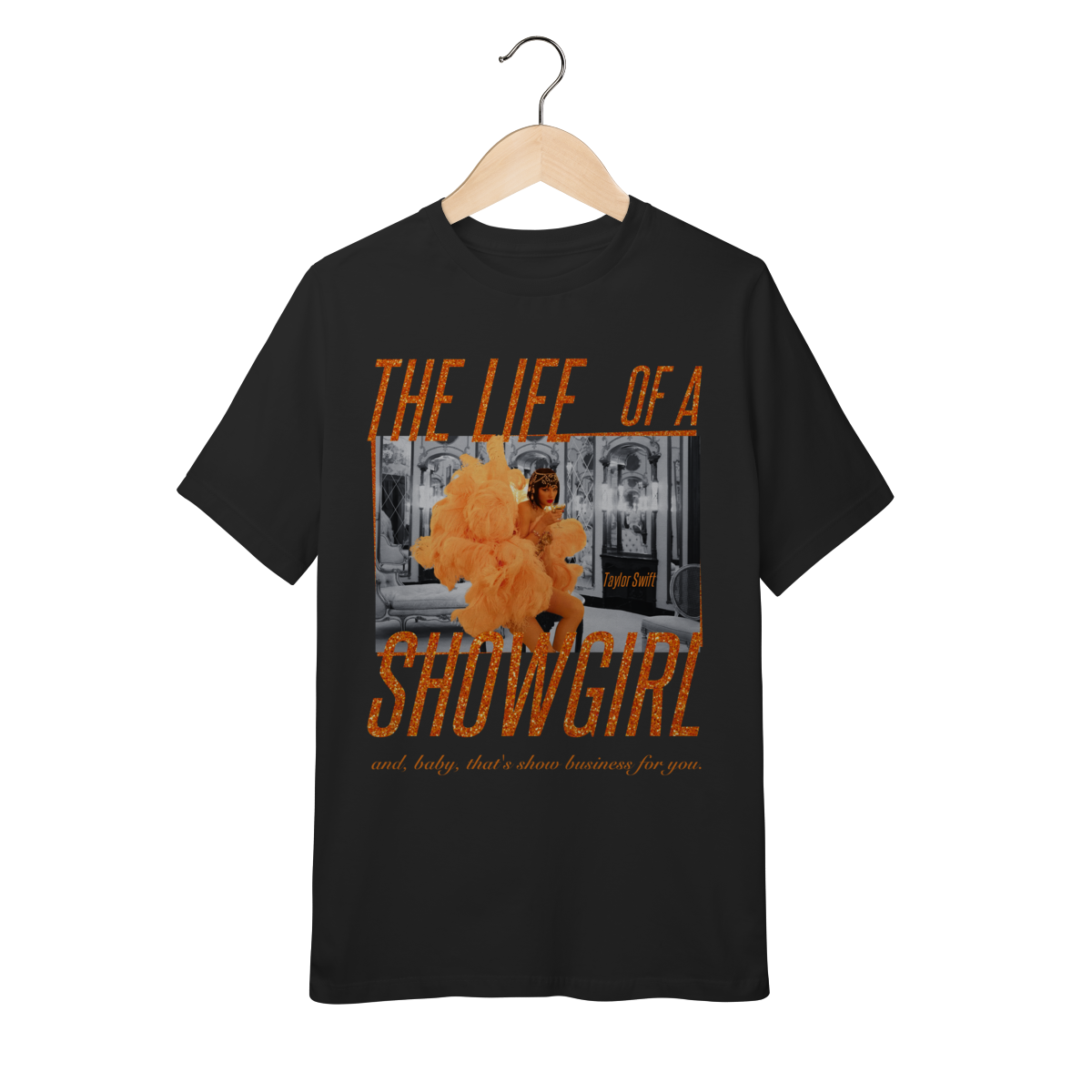 Baby Tee inspirada no álbum The Life of a Showgirl da cantora Taylor Swift. O que acontece depois do show? Nos bastidores? O photoshoot do álbum traz esse cenário e arte da camiseta é um reflexo dessa vida de artista, entrando numa das mentes mais brilhantes do mundo pop.