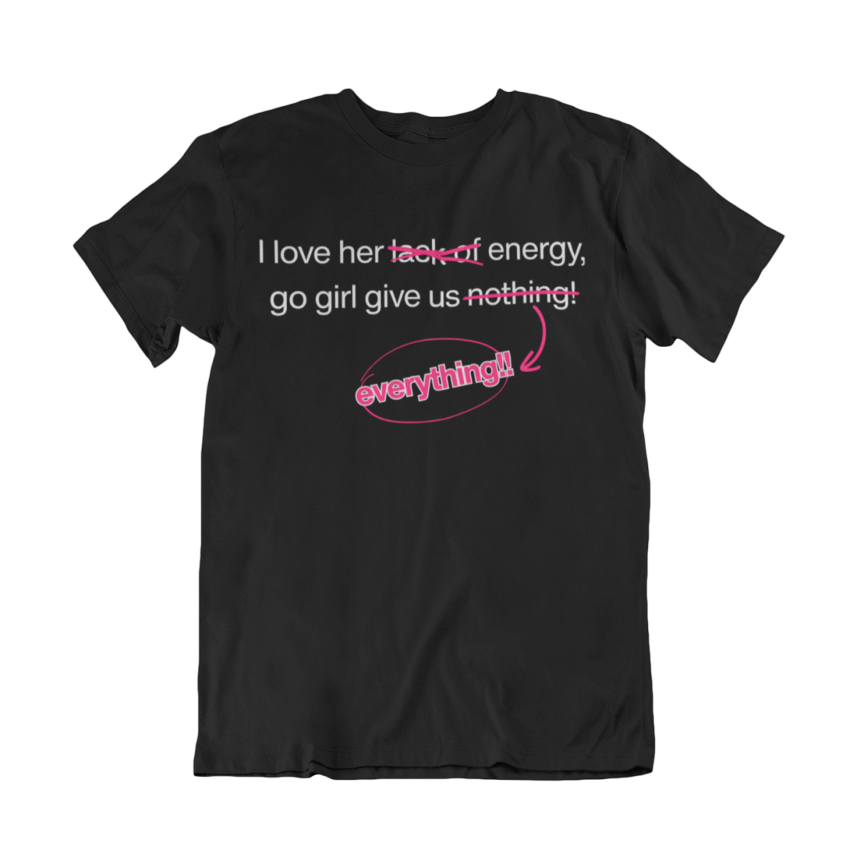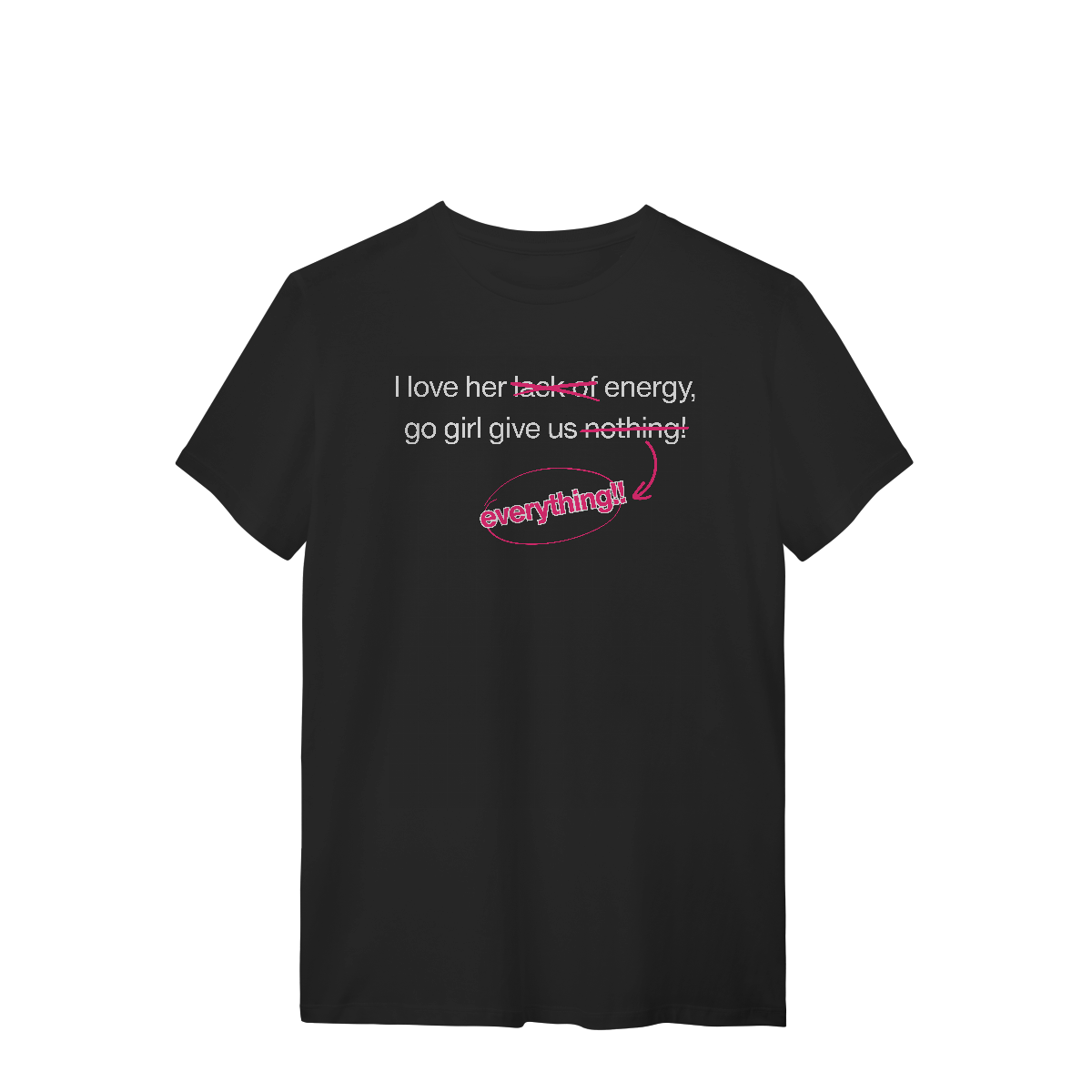 Camiseta inspirada no meme "go girl give us nothing", mostrando como na verdade a Dua Lipa é energética e sempre entrega!