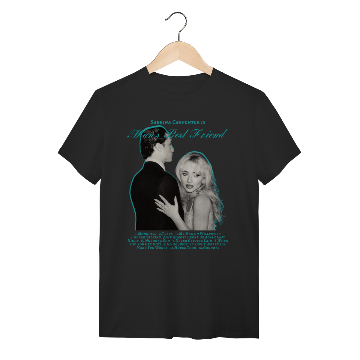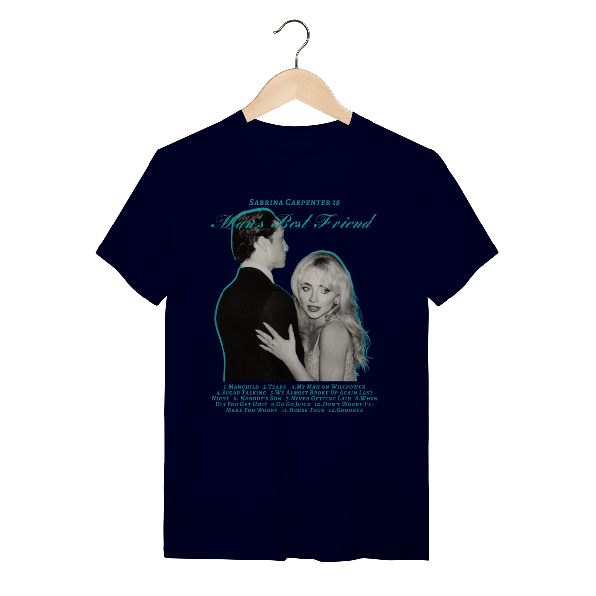Camiseta inspirada no álbum Mans Best Friend da Sabrina Carpenter, com toques azulados e tracklist.