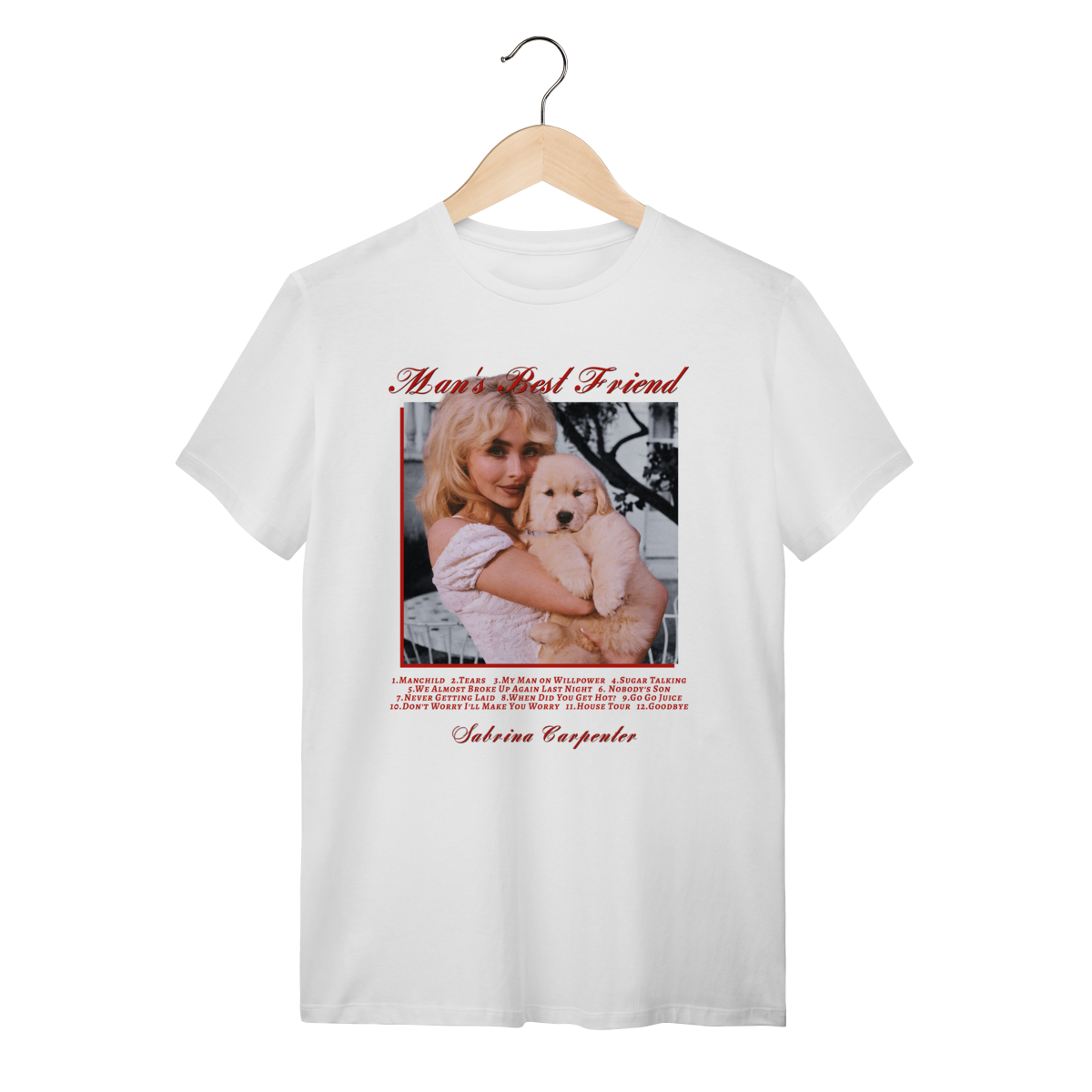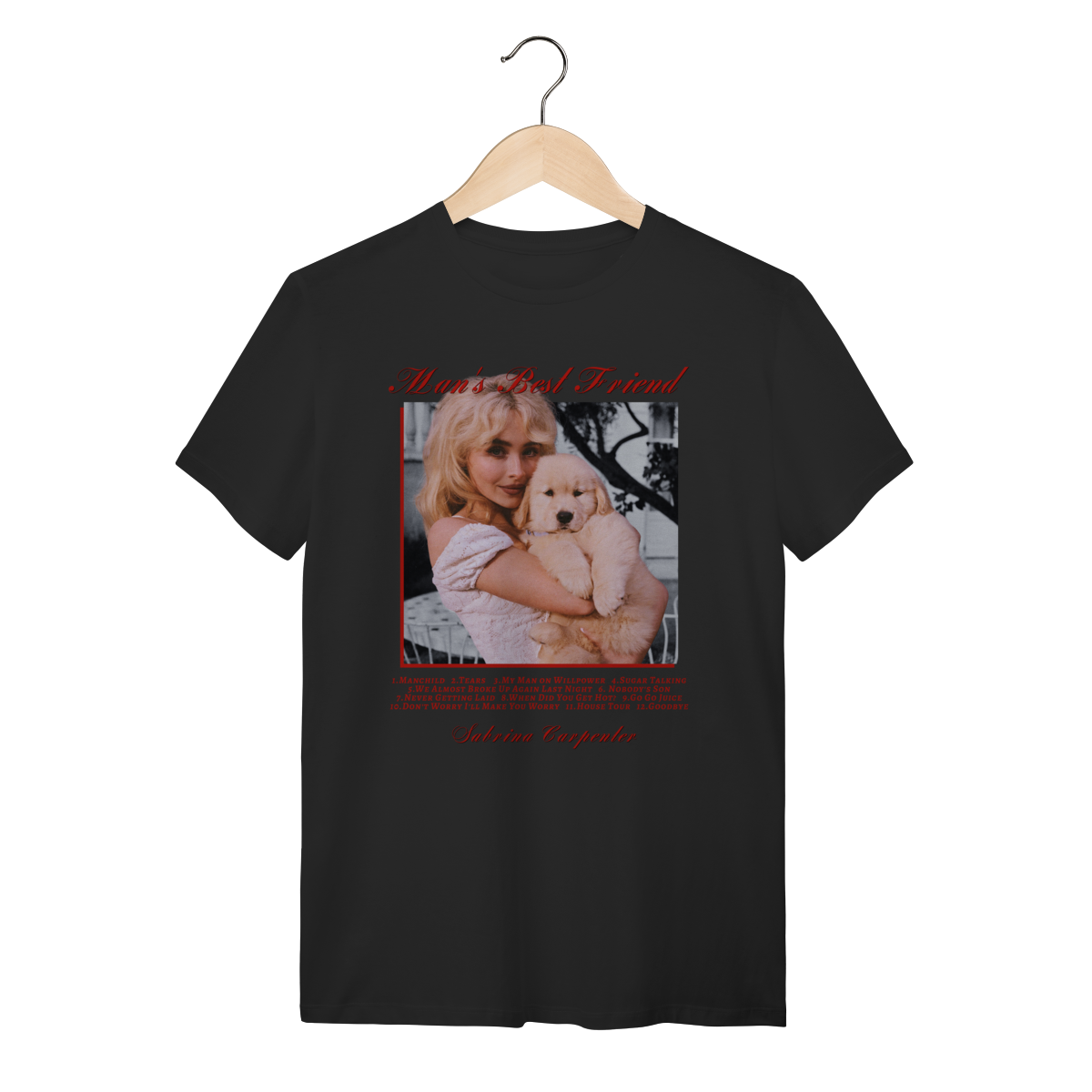 Camiseta inspirada no álbum Mans Best Friend da Sabrina Carpenter, com toques em vermelho e tracklist.