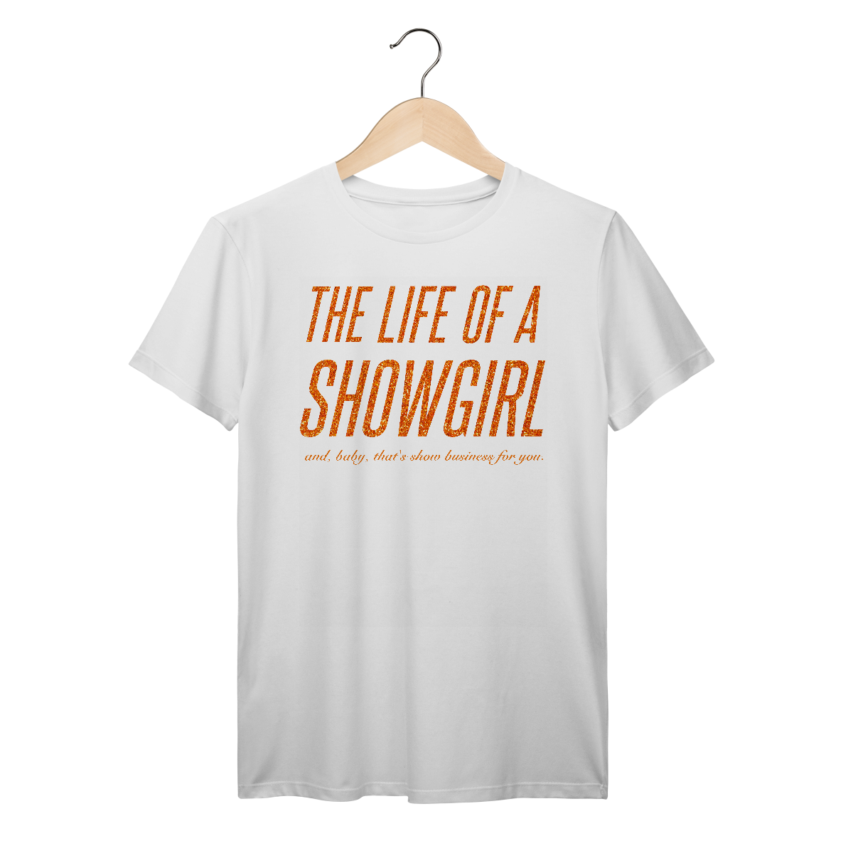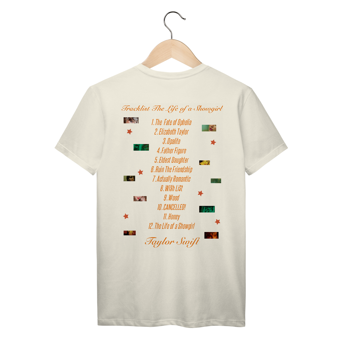Camiseta inspirada no álbum The Life of a Showgirl da cantora Taylor Swift. O que acontece depois do show? Nos bastidores? O photoshoot do álbum traz esse cenário e arte da camiseta é um reflexo dessa vida de artista, entrando numa das mentes mais brilhantes do mundo pop.